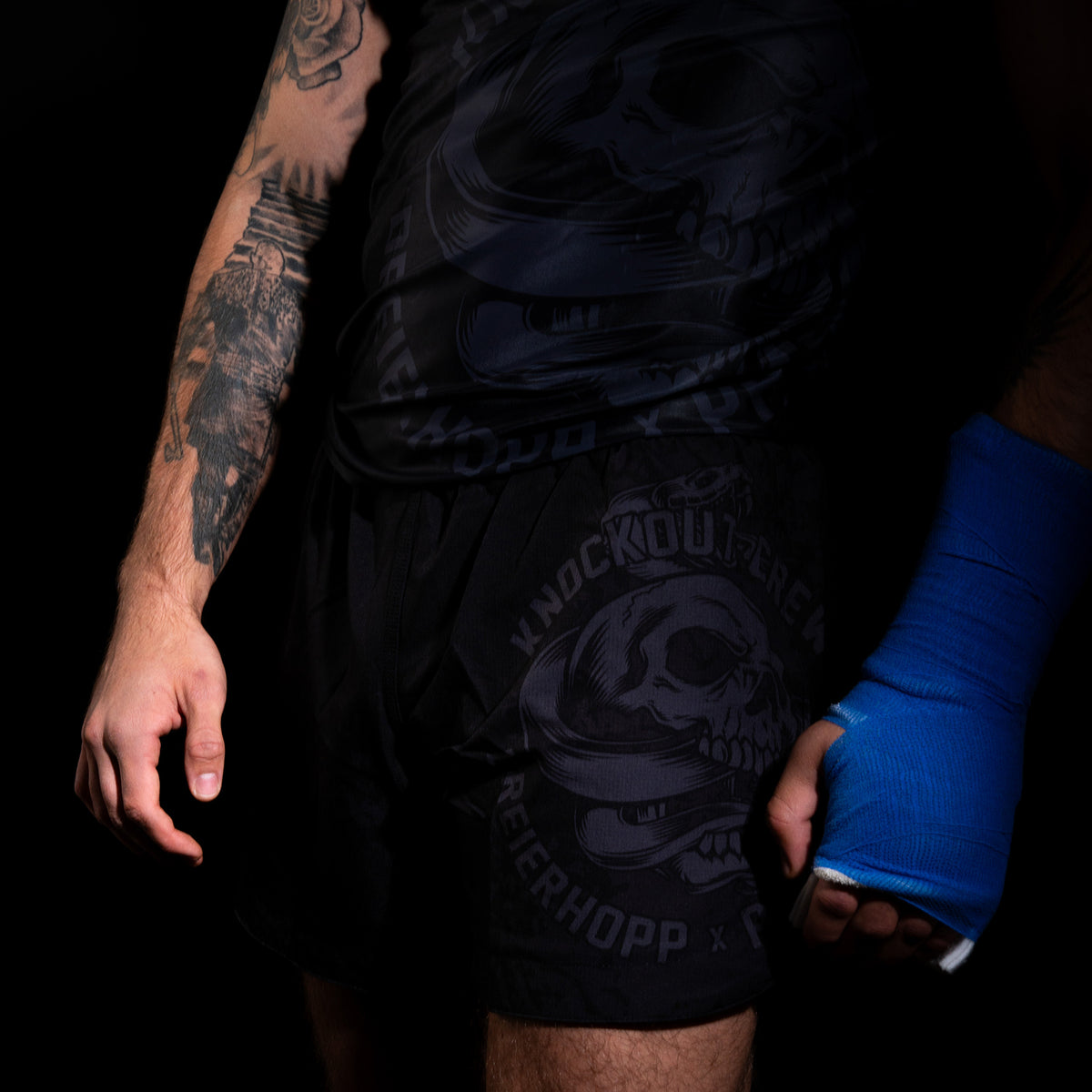Um die Kollektion rund und stimmig zu gestalten, haben wir uns an der großen Palette der Phantom Athletics Produkte bedient. Neben den klassischen T-Shirts mussten wir euch natürlich auch Bandagen und MMA Handschuhe produzieren. Um das Outfit abzuschließen durften Compression-Shorts, Rashguard und eine kurze MMA Hose nicht fehlen. Größen und Produktion durch Phantom - T-Shirt kleiner als Dreierhopp!
